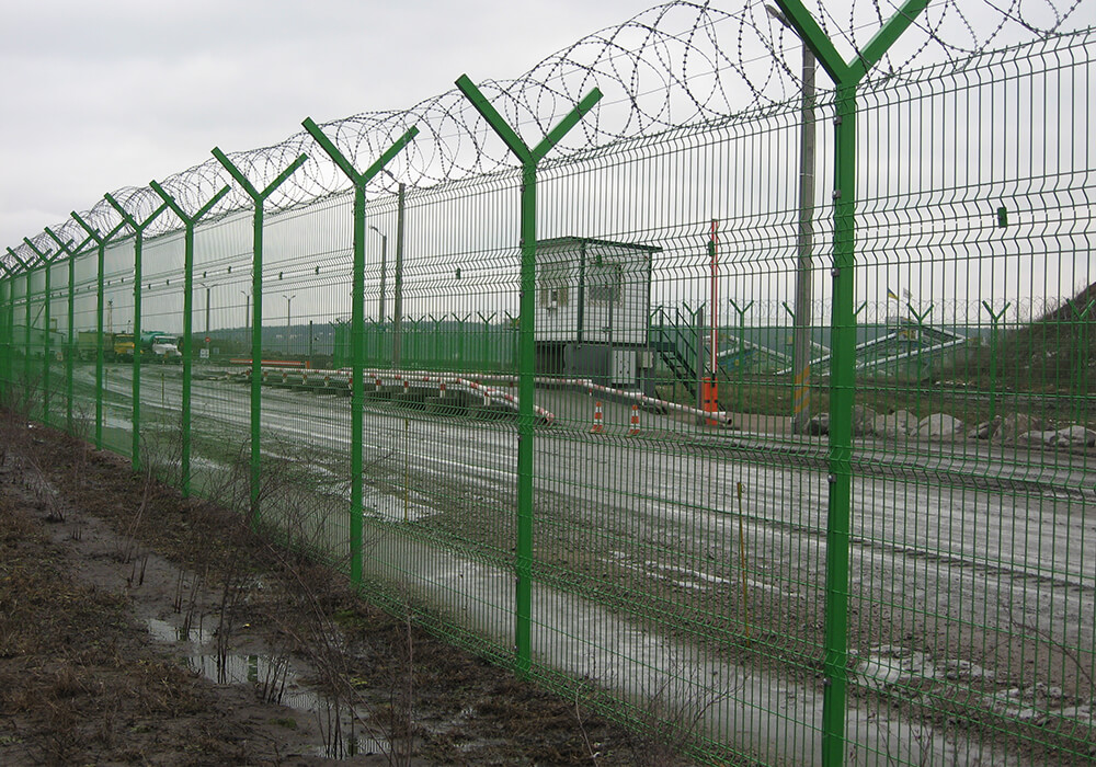 Зовні паркан "Рубіж" виглядає як сітка, а вертикальні прути зверху вигнуті V-подібним способом;